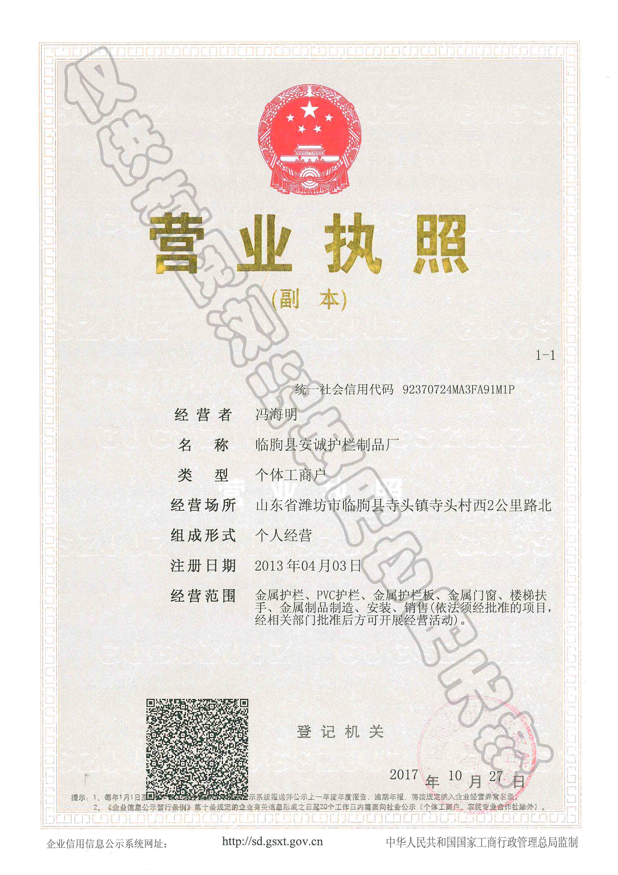 臨朐縣安誠(chéng)護(hù)欄制品廠(chǎng)生產(chǎn)的圍墻欄桿暢銷(xiāo)全國(guó),產(chǎn)品包括:鋅鋼護(hù)欄、鐵藝護(hù)欄,鍍鋅護(hù)欄、百葉窗,公路護(hù)欄、橋梁護(hù)欄、陽(yáng)臺(tái)護(hù)欄,鐵藝大門(mén)、電動(dòng)伸縮門(mén)、道路護(hù)欄、綠化欄桿、鐵藝圍欄、鐵藝欄桿、遠(yuǎn)景圍欄、鐵藝圍墻、欄桿、護(hù)欄、圍欄、柵欄等鐵藝制品、園林工程。系列產(chǎn)品的設(shè)計(jì)與施工。是家集設(shè)計(jì)、生產(chǎn)、銷(xiāo)售、安裝于身的大型私營(yíng)企業(yè)。主要經(jīng)營(yíng)護(hù)欄、大門(mén)、園林工程等。